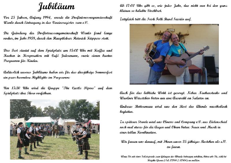 Seit 1958 existiert die Dorfinteressengemeinschaft Wanlo als Verein von und für Bürger in Wanlo. Im Jahre 1994 erfolgte die Eintragung als e.V. Das diesjährige Sommerfest am 22. Juni auf dem Spielplatz "Im Tal" wird daher zum Jubiläumsfest des Vereins. Aus diesem Anlass werden traditionelle Elemente wie das Stockbrotgrillen um viele weitere Highlights ergänzt, vor allem musikalisch wird einiges geboten.